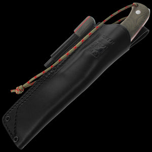 The knife is accompanied by a top quality leather sheath in black, with high-resistance riveted stitching. The two-position belt and "dangler" belt loop allows this sheath to be positioned so that it is always to hand.