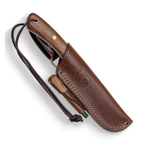 The knife is accompanied by a top quality, stitched and riveted brown leather sheath. The two-position belt and "dangler" belt loop allows this sheath to be positioned so that it is always to hand. This version also features an integral matching walnut firestriker.