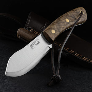 The Joker Nessmuk Knife is a full-tang outdoor knife with a typical leaf-shaped, Scandi grind blade made of Sandvik 14C28N stainless steel with a blade length of 11cm, a thickness of 3.7 mm, and a handle length of 11.8 cm.